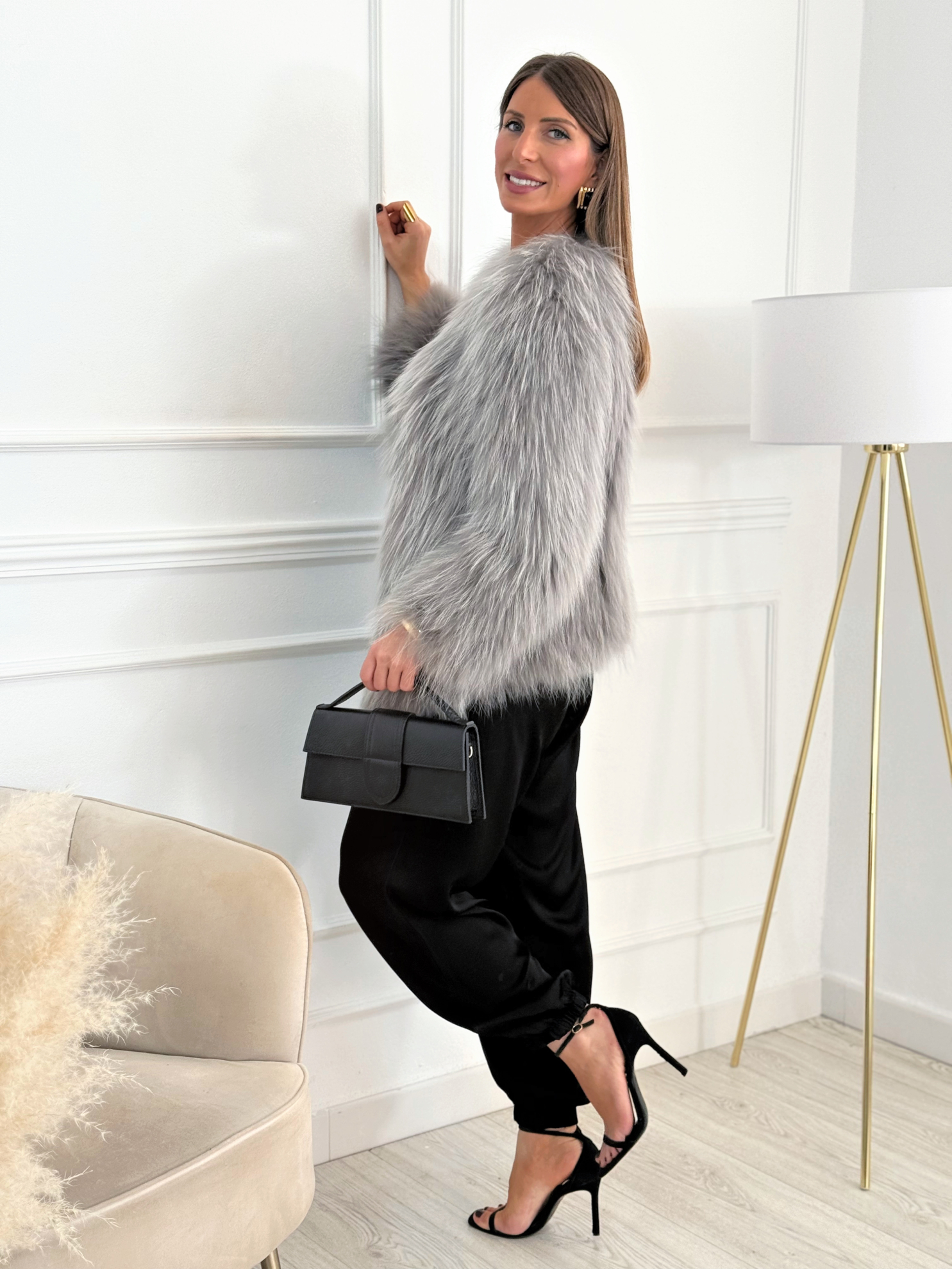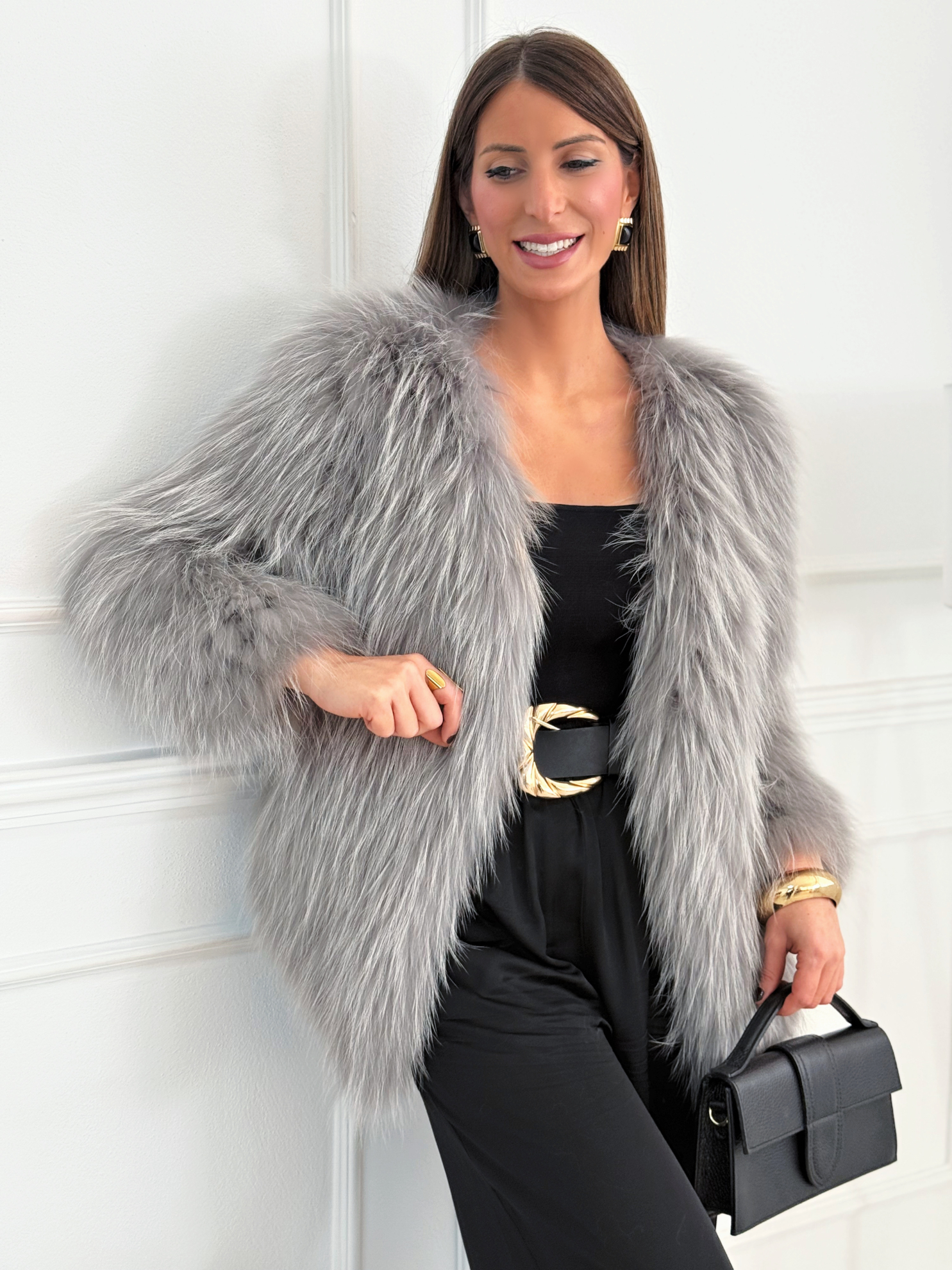 Abrigo confeccionado en auténtico pelo natural de zorro, de color gris con matices naturales que aportan profundidad y elegancia. Su corte recto y largo medio estilizan la figura, ofreciendo una silueta sofisticada y atemporal. El interior está cuidadosamente forrado para garantizar comodidad y un acabado impecable. Perfecto para ocasiones especiales o para elevar cualquier look con un toque de distinción y glamour.