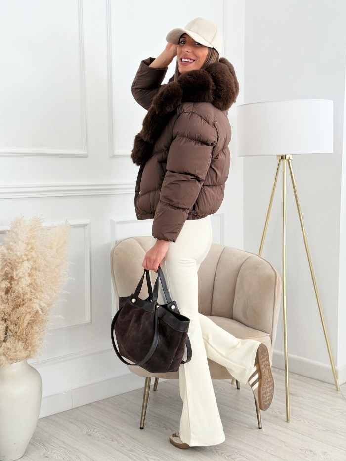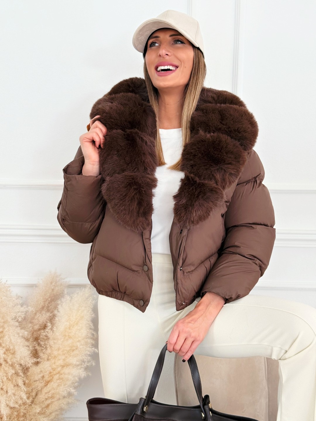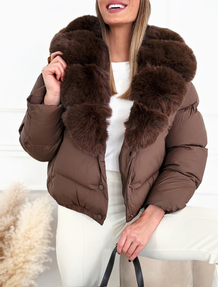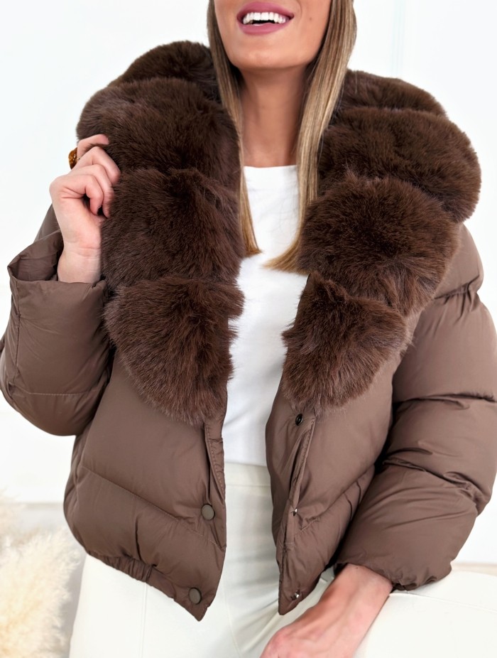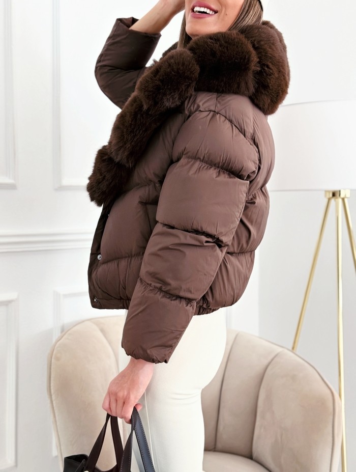 Este anorak en tono chocolate es la prenda clave de tu armario de invierno. Su diseño acolchado con volumen y el espectacular cuello de pelo sintético extraíble te permiten adaptarlo fácilmente a cualquier ocasión: con el cuello puesto para un estilo sofisticado y abrigado, o sin él para un look más casual y urbano. Cuenta con cierre frontal de botones a presión, interior forrado que mantiene el calor y un corte ligeramente corto que estiliza la figura. Ligero, elegante y muy versátil, será tu mejor aliado en los días fríos.