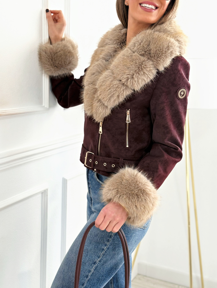 Nuestra biker de mujer en efecto piel de melocotón color burdeos es una chaqueta elegante y actual diseñada para elevar cualquier look de temporada. Su tejido suave y aterciopelado aporta un tacto muy agradable, mientras que el cuello y los puños de pelito añaden un acabado cálido y sofisticado. Incluye cremalleras doradas, bolsillos funcionales y cinturón ajustable para realzar la figura y aportar un estilo moderno. Esta biker corta combina a la perfección con jeans, vestidos o pantalones de polipiel, convirtiéndose en una prenda imprescindible para quienes buscan una chaqueta con pelito en un tono burdeos favorecedor y muy versátil.