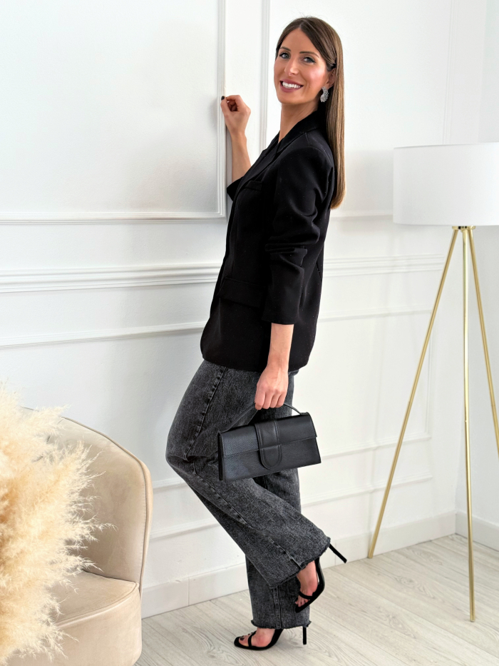 Esta blazer negra con piedrecitas efecto brillo es una prenda imprescindible para la temporada. Su diseño con solapas clásicas, cierre de un botón y corte estructurado estiliza la figura y aporta un aire elegante y moderno. El detalle de las pequeñas piedrecitas distribuidas por todo el tejido añade un toque de luz muy favorecedor, ideal para las fechas en las que estamos, donde los looks con brillo y estilo propio son los protagonistas. Perfecta tanto para cenas, eventos o celebraciones, combina a la perfección elegancia, versatilidad y comodidad.