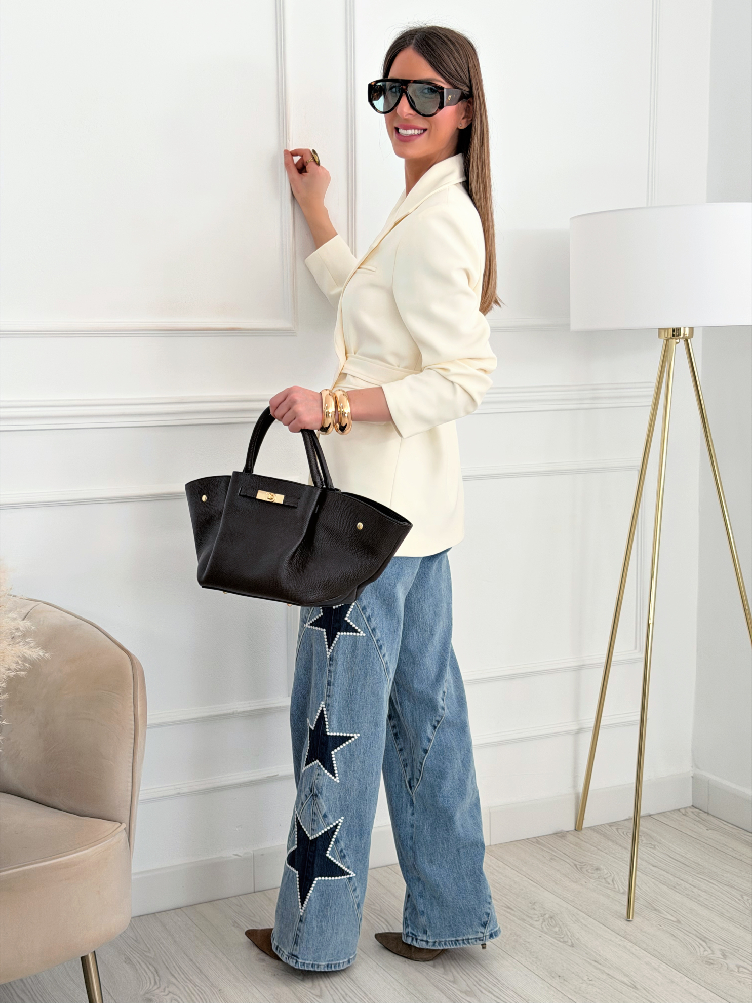 Ideal para combinar con vaqueros rectos o acampanados para un look casual sofisticado. Perfecta con pantalones de vestir y tacones para un outfit más formal. Se puede llevar con tops básicos o blusas satinadas para un estilo elegante. Combina perfectamente con bolsos y complementos en tonos neutros o dorados para potenciar su sofisticación.