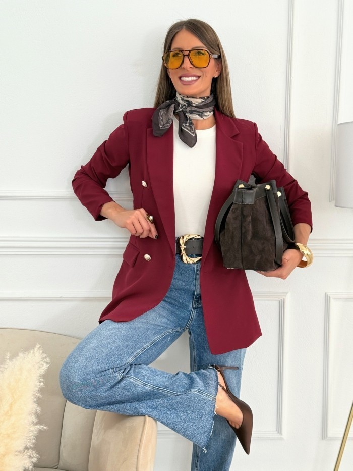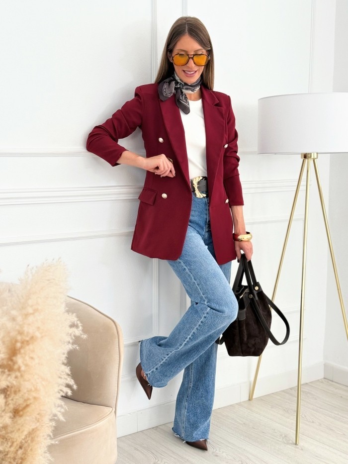 Esta blazer burdeos es la prenda perfecta para elevar cualquier look con un aire sofisticado y moderno. Su diseño de doble botonadura con botones dorados aporta un toque chic, mientras que su corte recto y la caída fluida estilizan la figura. Confeccionada en un tejido cómodo gracias a su ligero punto elástico, es ideal tanto para outfits de oficina como para combinar con vaqueros y crear un look casual elegante. Su largo de 74 cm proporciona una silueta favorecedora que estiliza y aporta versatilidad a la prenda.
