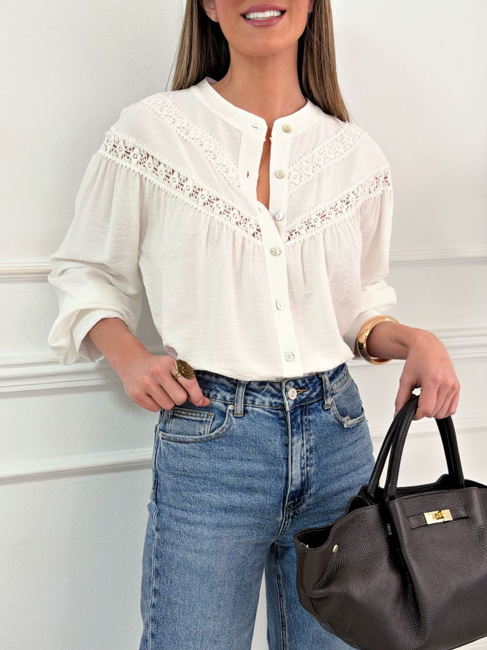 Blusa de corte fluido. Cuello redondo con abertura frontal y botones. Detalle de encaje decorativo en la parte superior. Manga larga con acabado relajado. Tejido ligero y cómodo. Diseño elegante y versátil.