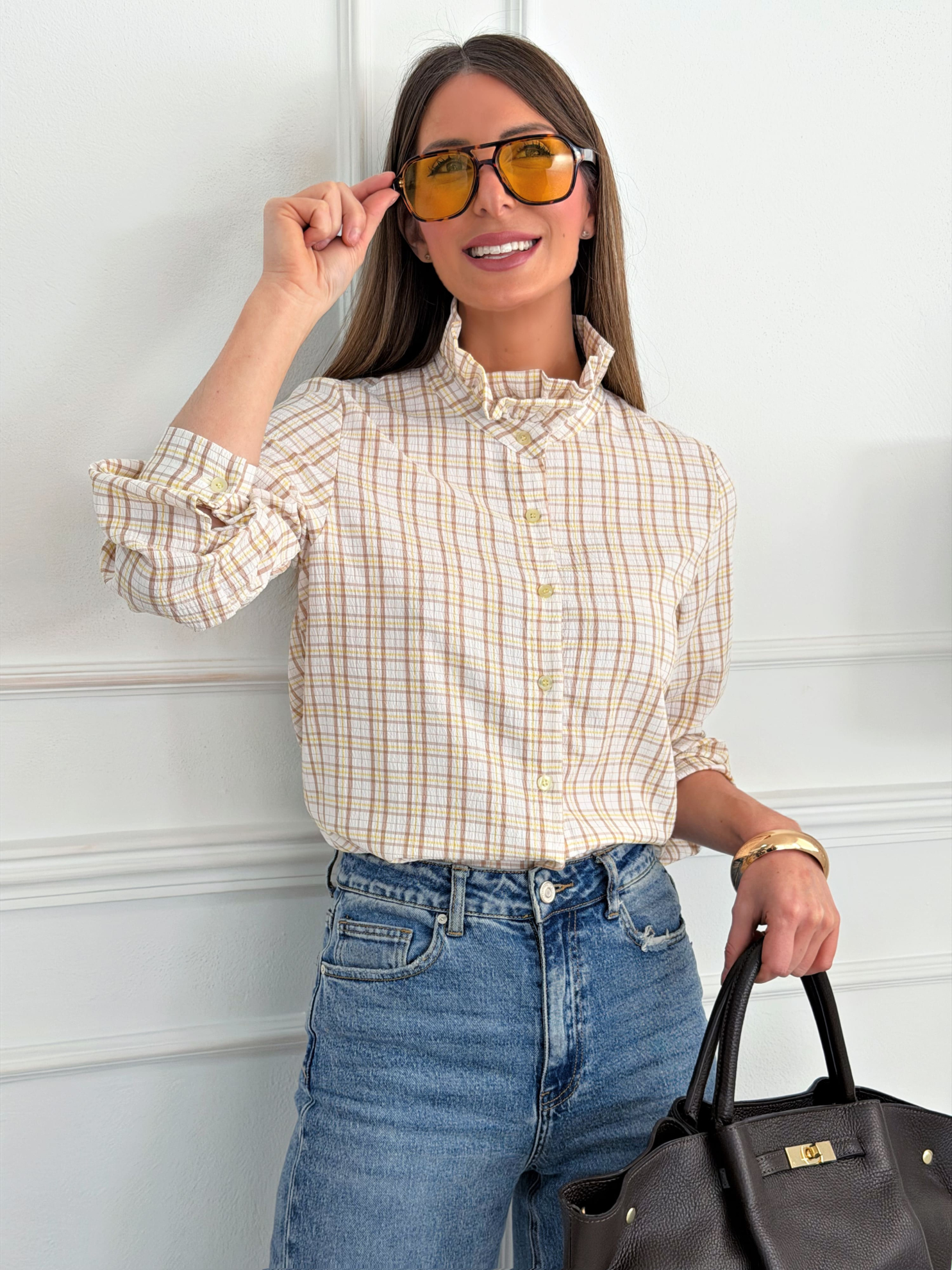 Blusa con base en tono claro y estampado de cuadros en tonos beige y amarillo que ilumina el rostro y aporta frescura al conjunto. Presenta cuello subido con acabado en volante que realza el escote y añade un detalle distintivo y favorecedor. Cuenta con cierre frontal mediante botones a tono, manga larga con ligero volumen y puño ajustado que aporta forma y comodidad. Su tejido ligero y agradable ofrece una caída natural que estiliza la silueta, convirtiéndola en una prenda versátil ideal tanto para looks casuales como para combinaciones más arregladas.