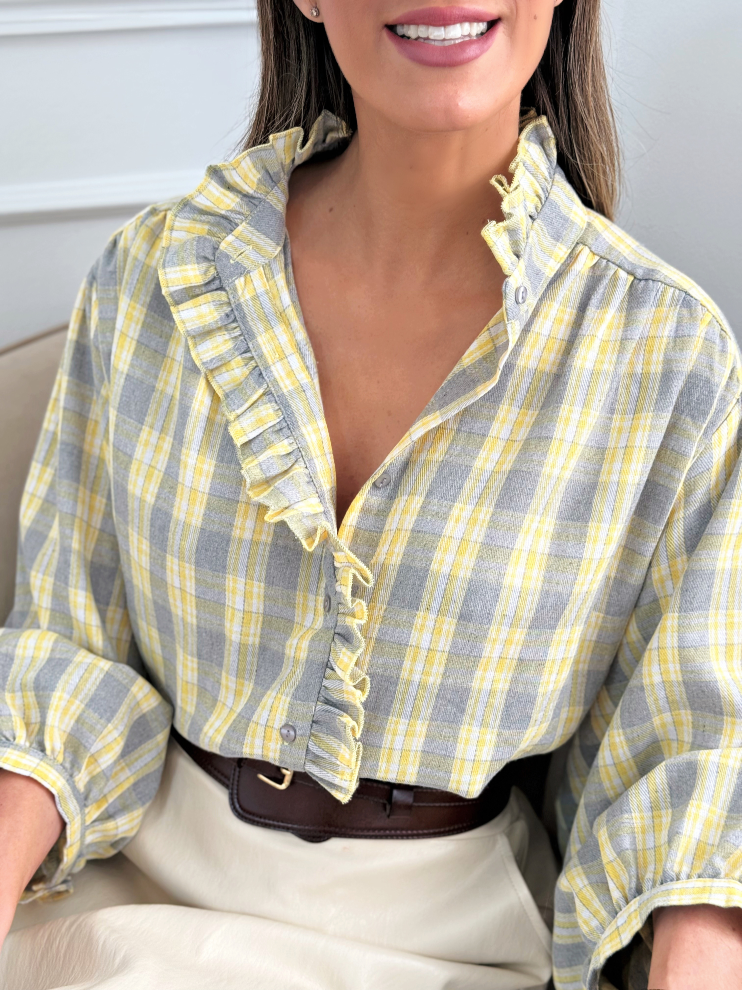 Esta camisa de cuadros está confeccionada en una mezcla de algodón y poliéster que aporta suavidad, ligereza y comodidad durante todo el día. Su diseño destaca por el volante decorativo en el delantero y el cuello ligeramente abierto, que estiliza el escote y aporta un aire femenino y actual. El corte oversize ofrece un ajuste holgado y favorecedor, ideal para diferentes tipos de silueta. Una prenda versátil y atemporal, perfecta para combinar tanto en looks casuales como en estilismos más cuidados.