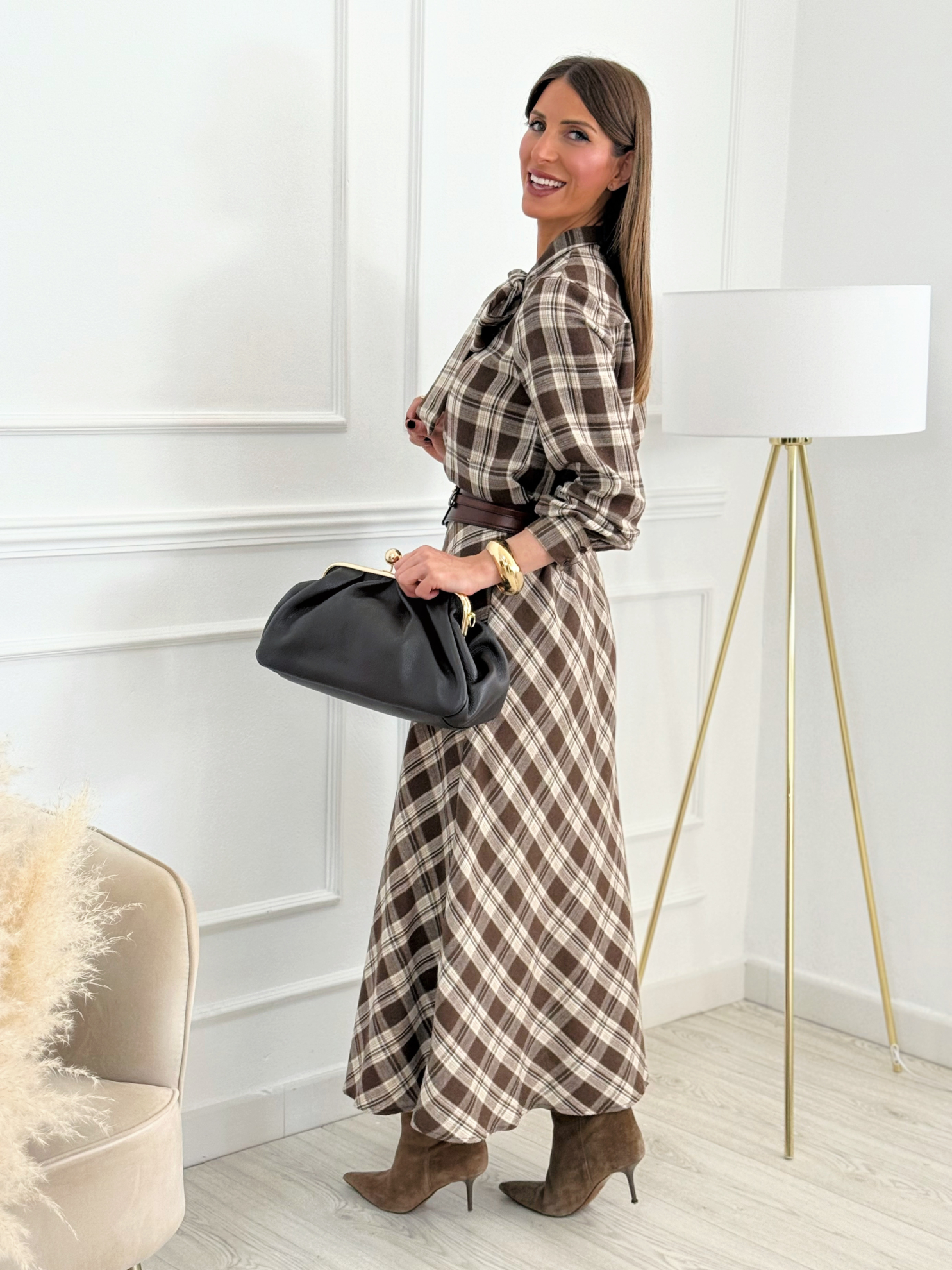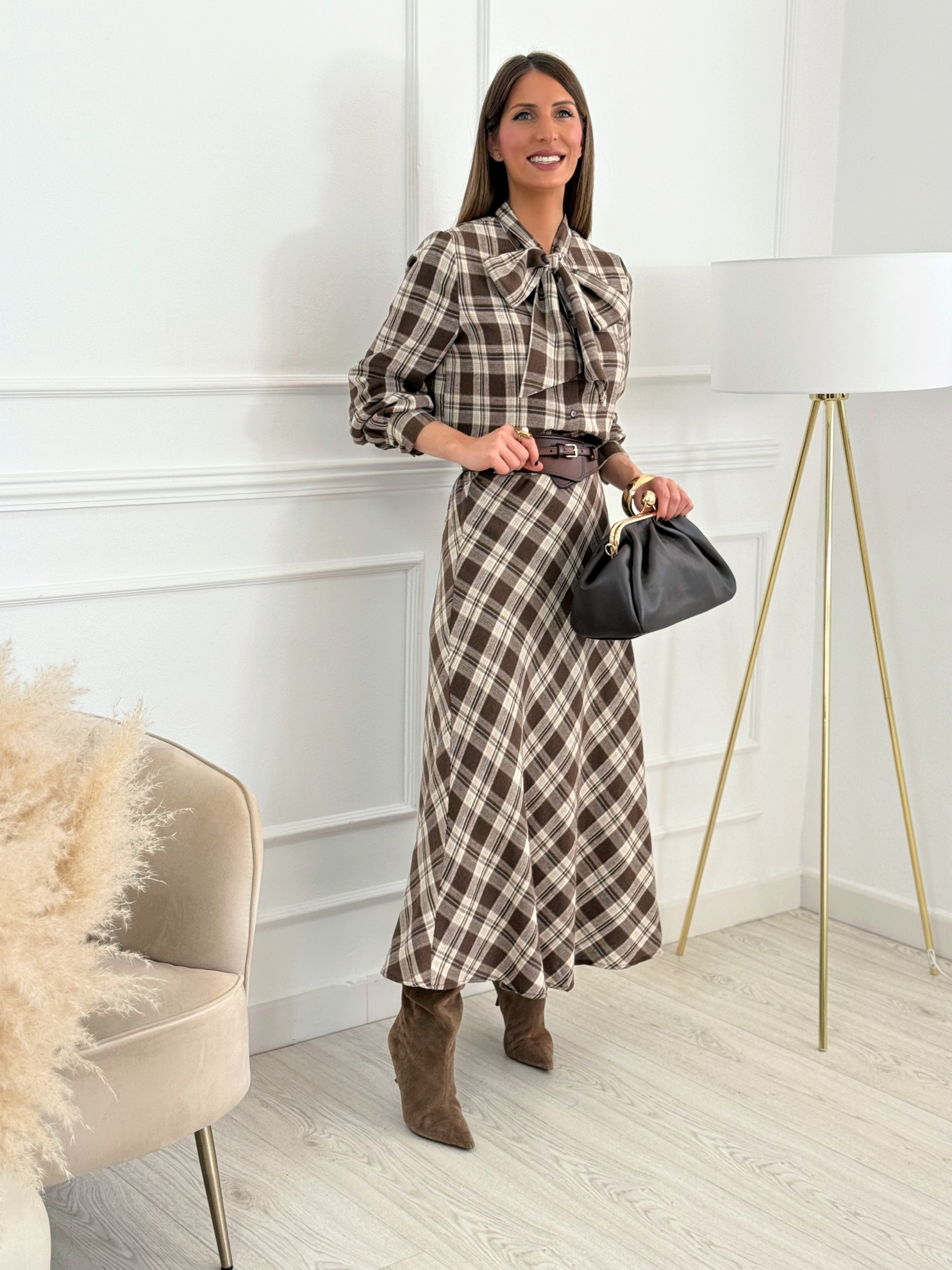 Blusa de cuadros en tonos marrón chocolate con diseño estilizado y muy femenino. Incorpora un lazo grande en el cuello que aporta un toque sofisticado, mangas largas con ligero volumen y corte recto que sienta genial. Está confeccionada en un tejido cálido y suave de poliéster y algodón, ideal para combinar tanto en outfits casual como en estilismos más arreglados. Una prenda versátil que realza cualquier look con un aire clásico y actual.