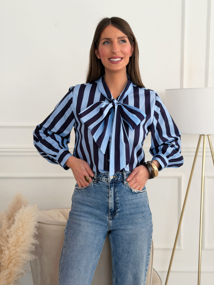 Blusa de mujer de rayas verticales en tonos azul marino y azul claro, con detalle de gran lazada al cuello que aporta un aire sofisticado y muy favorecedor. Su diseño combina elegancia y frescura, convirtiéndola en una prenda ideal tanto para looks de oficina como para estilismos más casual chic.