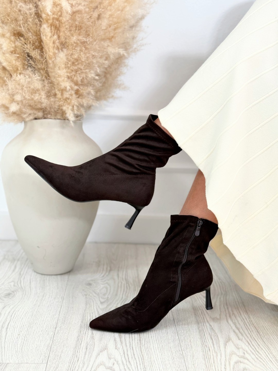 Este botín de tejido efecto ante en color chocolate es un básico imprescindible en tu armario. Su diseño estilizado con punta afilada y tacón fino aporta elegancia y feminidad a cualquier look, mientras que su textura suave imita a la perfección el ante natural. Gracias a su altura de tacón de 6 cm, ofrece el equilibrio perfecto entre estilo y comodidad, permitiéndote llevarlo durante todo el día sin renunciar al confort. El cierre lateral con cremallera facilita su colocación, y su diseño ajustado al tobillo estiliza la pierna, convirtiéndolo en el aliado perfecto tanto para looks casuales con jeans como para outfits más arreglados con vestidos o faldas.