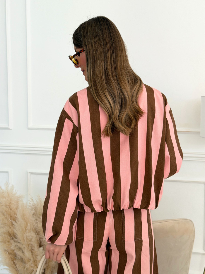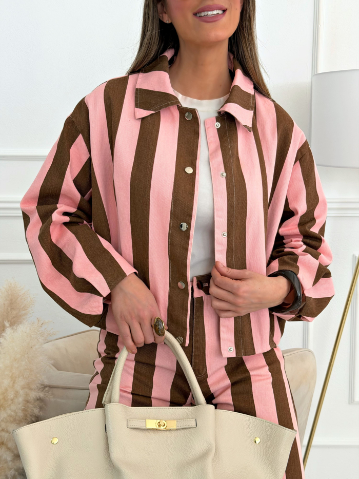 Cazadora denim estilo portugués para mujer con estampado de rayas verticales en tonos rosa y marrón. Un diseño diferente y muy favorecedor que aporta carácter y estilo a cualquier look. Su corte recto con sisa amplia proporciona comodidad y caída natural, adaptándose con facilidad a distintas siluetas. El tejido exterior 100% algodón aporta estructura y calidad, mientras que el forro interior 100% poliéster mejora el confort. Con un largo de 56 cm, es ideal para combinar con pantalones de tiro alto o llevar como conjunto coordinado. Una cazadora versátil y moderna, perfecta para entretiempo y para quienes buscan prendas especiales con un aire europeo y sofisticado.