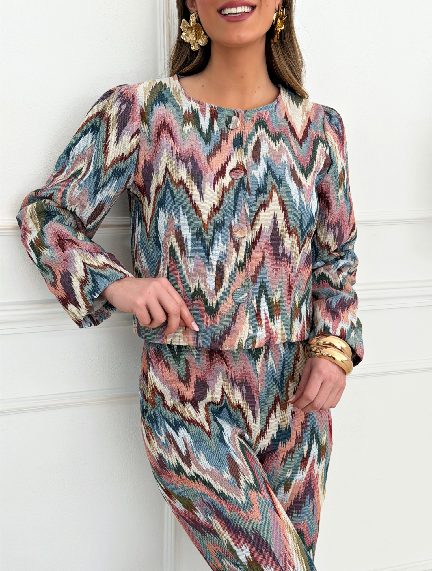 Chaqueta estampada para mujer con diseño multicolor de estilo elegante y actual, ideal para crear looks únicos y con personalidad. Su tejido con textura y su estampado en tonos combinados la convierten en una prenda especial, perfecta tanto para eventos como para elevar outfits más sencillos.