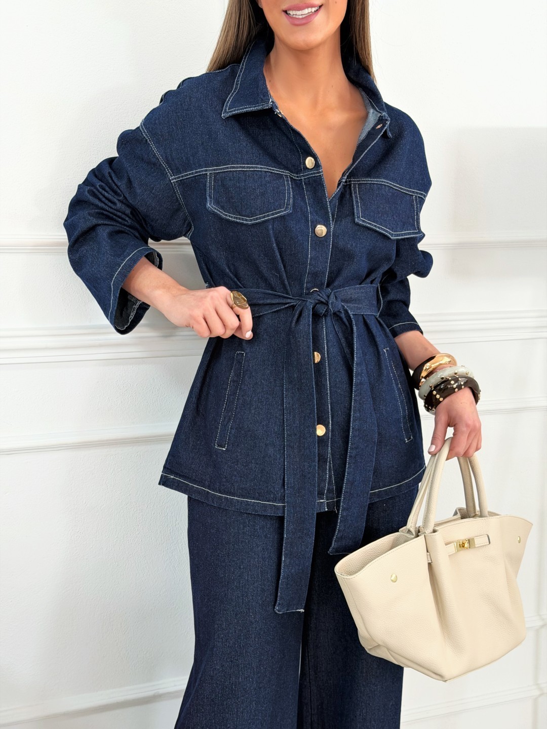Chaqueta vaquera de mujer · Botones de presión metálicos · Lazo ajustable en la cintura · Bolsillos delanteros · Tejido fluido y cómodo · Corte recto con ajuste regulable · Ideal para entretiempo