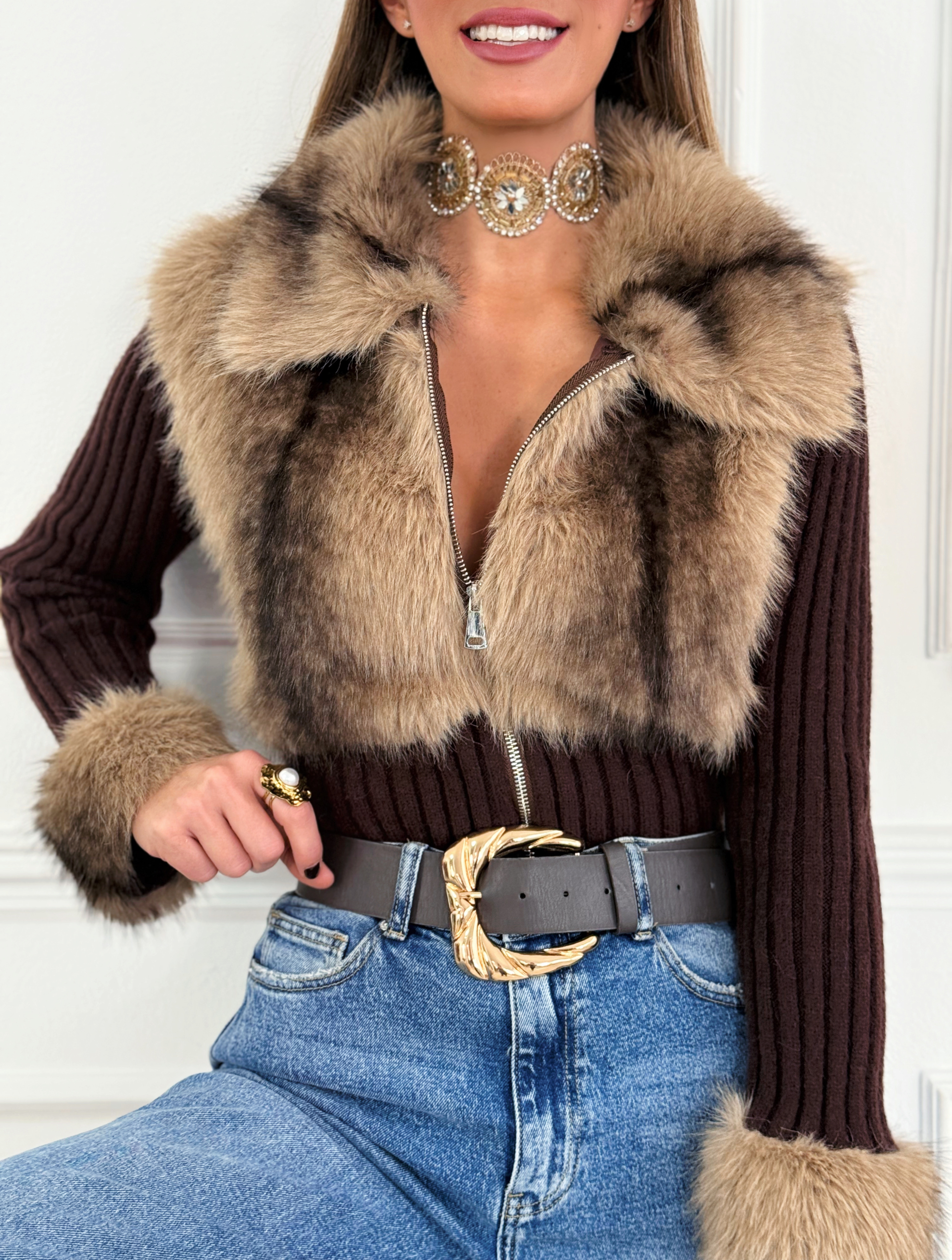 Esta chaqueta de punto combinada con pelo es una prenda única que combina comodidad, estilo y calidez. Su diseño con cremallera delantera, cuello voluminoso y puños en pelo aporta un aire distinguido y versátil, perfecto tanto para looks casuales como más arreglados. El tejido de punto suave y el detalle de pelo sintético hacen que sea una prenda imprescindible en tu armario para los días más fríos.