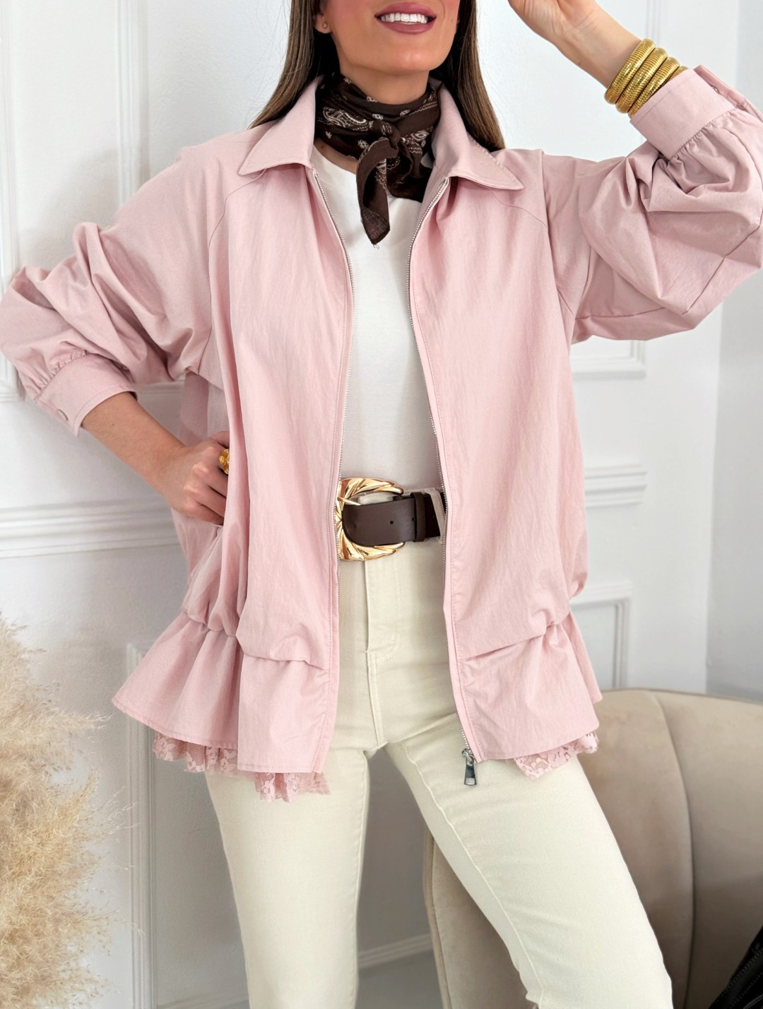 Esta chaqueta ligera destaca por su diseño delicado y muy femenino en un elegante tono rosa empolvado. Está confeccionada en una mezcla de algodón y poliamida, lo que la hace ligera, cómoda y resistente, ideal para el entretiempo. Presenta cuello camisero, cierre frontal con cremallera y un corte recto que se completa con un doble volante en la parte inferior: un volante exterior liso y un segundo volante interior tipo puntilla que aporta textura, movimiento y un toque romántico al diseño. Su talla única y ajuste cómodo permiten adaptarse fácilmente a distintas siluetas, convirtiéndola en una prenda versátil y especial para elevar cualquier look.