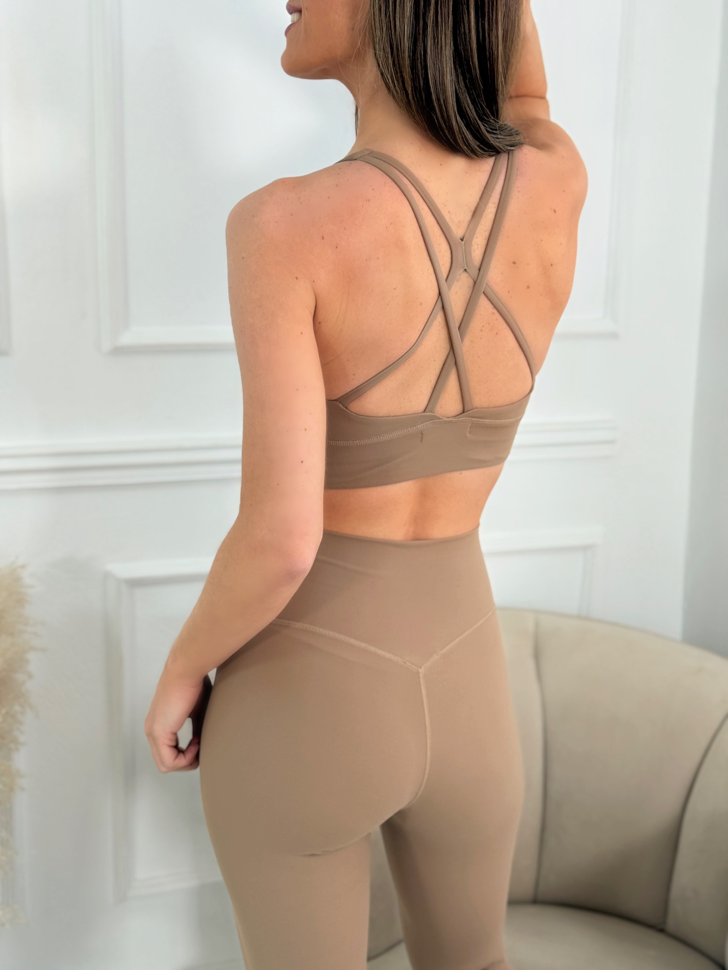 Conjunto deportivo para mujer formado por top y pantalón legging en color camel. El top incorpora almohadillas extraíbles en el pecho, aportando sujeción, comodidad y un bonito realce. Presenta escote redondeado y espalda cruzada con tirantes que permiten total libertad de movimiento. El pantalón cuenta con cintura alta efecto moldeador que se adapta al cuerpo sin oprimir, estilizando la silueta. Confeccionado en tejido técnico elástico, ofrece un ajuste cómodo y envolvente, perfecto tanto para entrenamientos como para el día a día. Un conjunto actual, elegante y muy versátil.