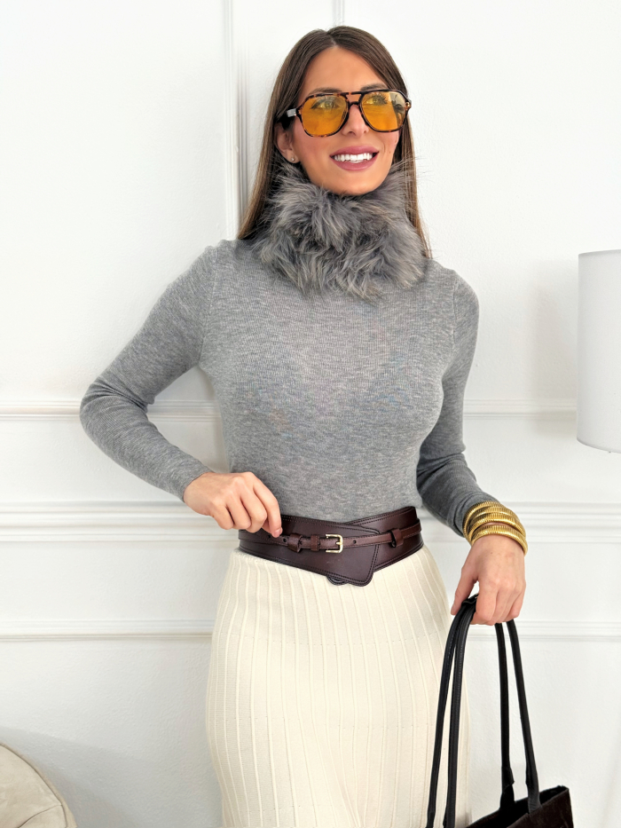 Cuello de pelo natural de zorro en color gris que también puede utilizarse como gorro gracias a su base de malla elástica. Esta estructura flexible permite ajustarlo perfectamente alrededor del cuello o llevarlo como un gorro de invierno con volumen. El pelo es abundante, suave y muy ligero, ofreciendo calidez y un estilo sofisticado. Su tono gris combina con cualquier look y lo convierte en un accesorio elegante, versátil y perfecto para los meses fríos.