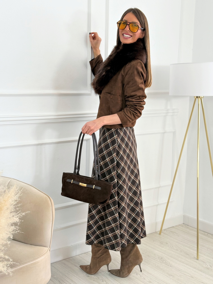 Falda midi de cuadros en color chocolate, con un estampado clásico y elegante que combina a la perfección con tonos tierra, beige, crudo o negro. Su tejido tiene cuerpo y una caída muy bonita, aportando movimiento sin añadir volumen. La cinturilla elástica se adapta fácilmente y ofrece comodidad durante todo el día. Su corte evasé estiliza la figura y la convierte en una prenda ideal tanto para looks casual como más formales.