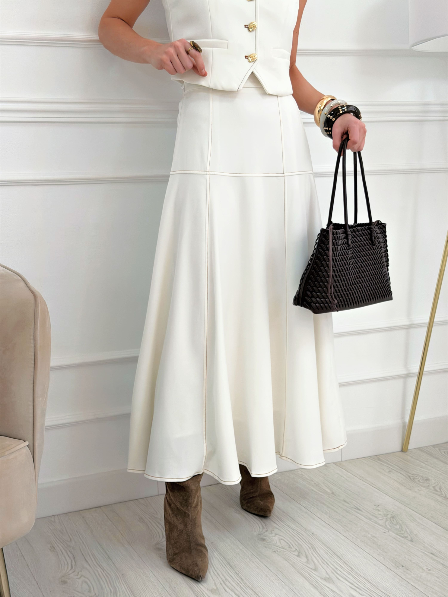 Las costuras en contraste camel aportan un detalle sofisticado que realza el diseño y combina perfectamente con prendas en tonos tierra. Su largo midi la convierte en una opción ideal tanto para looks formales como para estilismos más relajados. Puede combinarse con su chaleco a juego para crear un conjunto coordinado muy elegante o con blusas y camisas para estilismos versátiles y actuales.