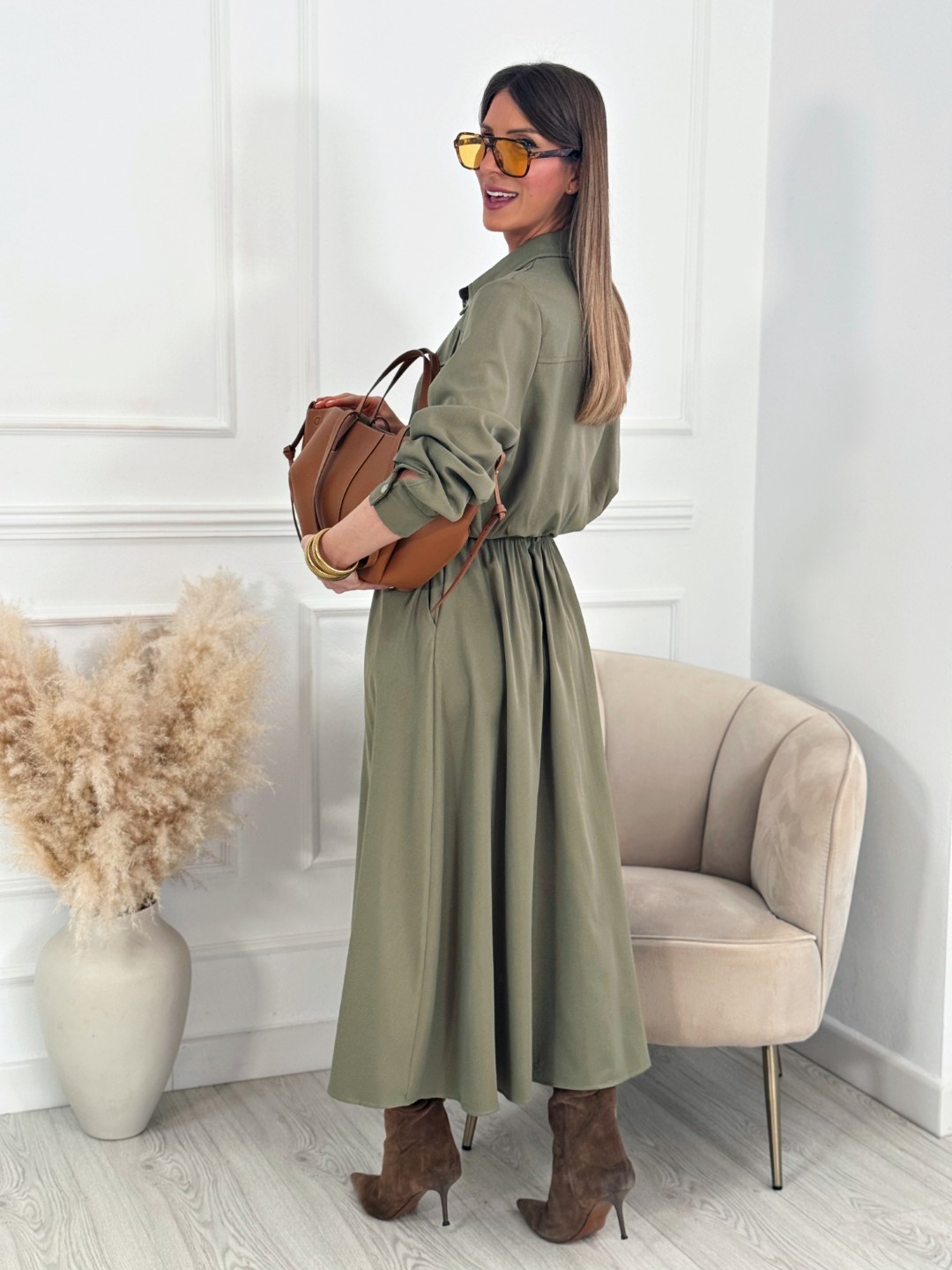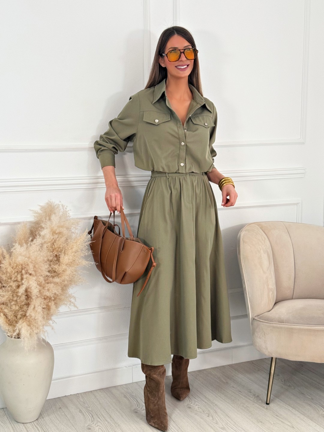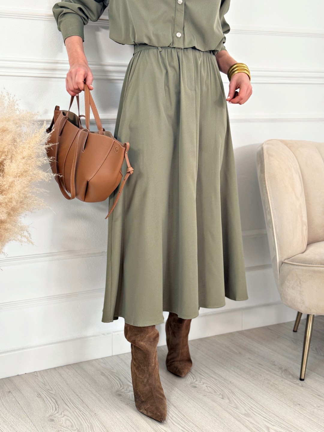 Esta falda verde es una prenda elegante y muy versátil, ideal para crear looks femeninos y actuales en cualquier ocasión. Su diseño midi y corte evasé aporta movimiento y estiliza la silueta, mientras que la cintura con goma elástica en la parte trasera se adapta perfectamente al cuerpo sin oprimir. Confeccionada en tejido ligero y fluido, ofrece una caída suave y cómoda, perfecta tanto para el día a día como para ocasiones más especiales. El tono verde es fácil de combinar y aporta un aire sofisticado que encaja a la perfección con tonos tierra, beige, crudos o marrones.