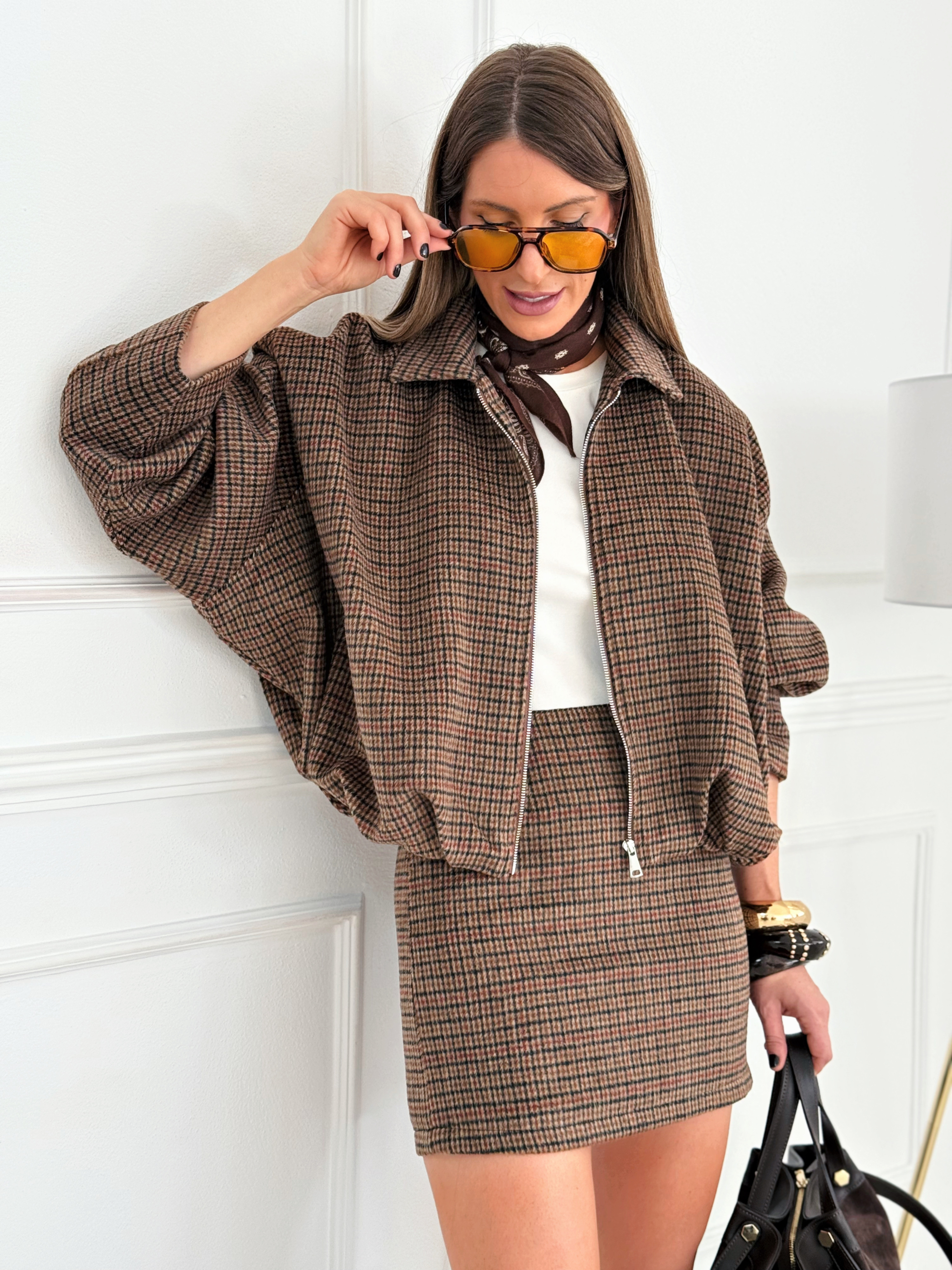 Falda corta confeccionada en un suave tejido de paño con mezcla de fibras que aporta estructura, comodidad y un ajuste perfecto. Su diseño recto y minimalista realza la silueta y la convierte en una prenda clave para crear looks tanto casuales como más formales. El tejido con dibujo clásico en tonos marrones añade un toque sofisticado y atemporal, ideal para combinar con camisas, jerséis o chaquetas coordinadas. Incluye forro interior para mayor confort y mejor caída.