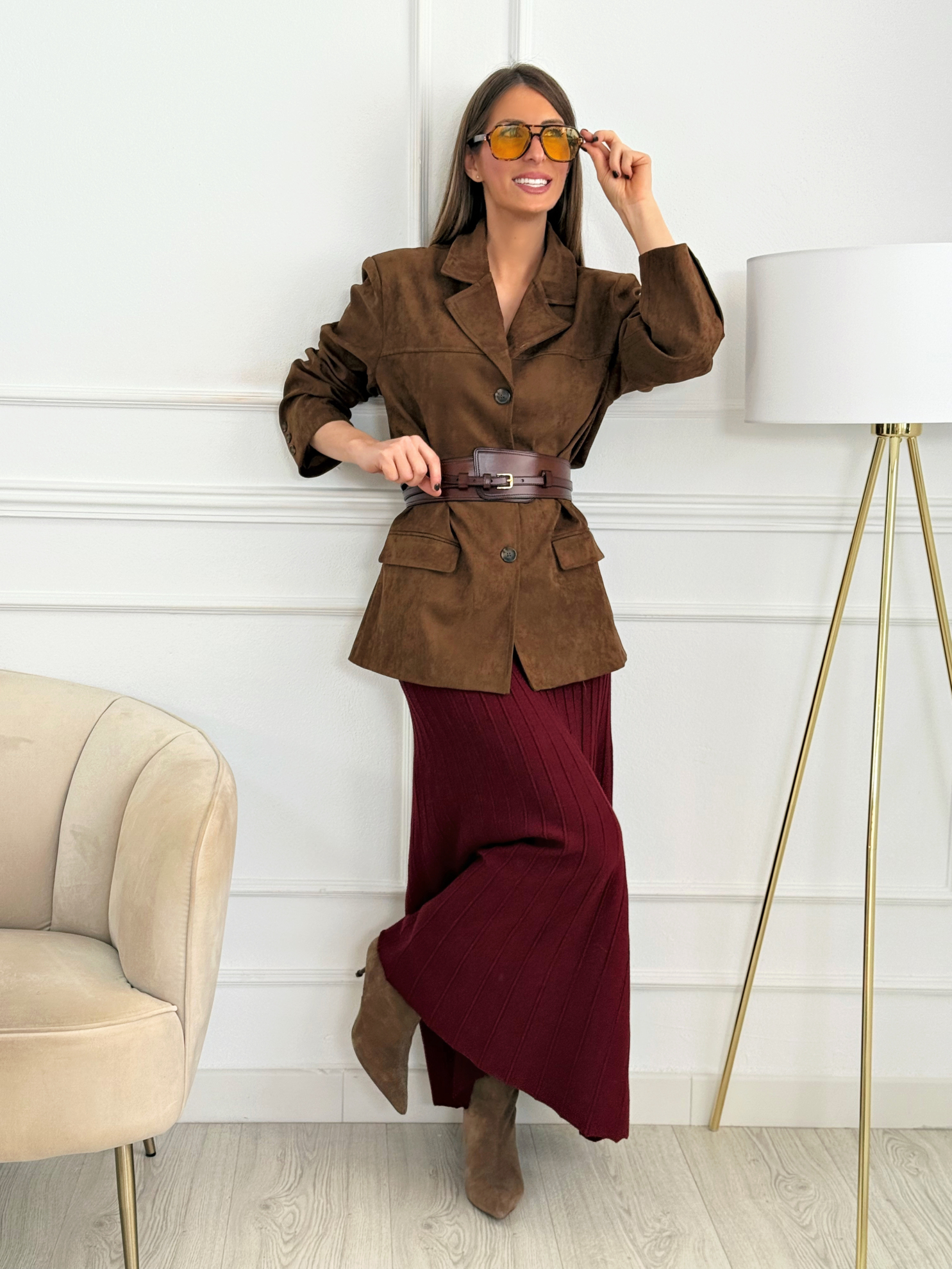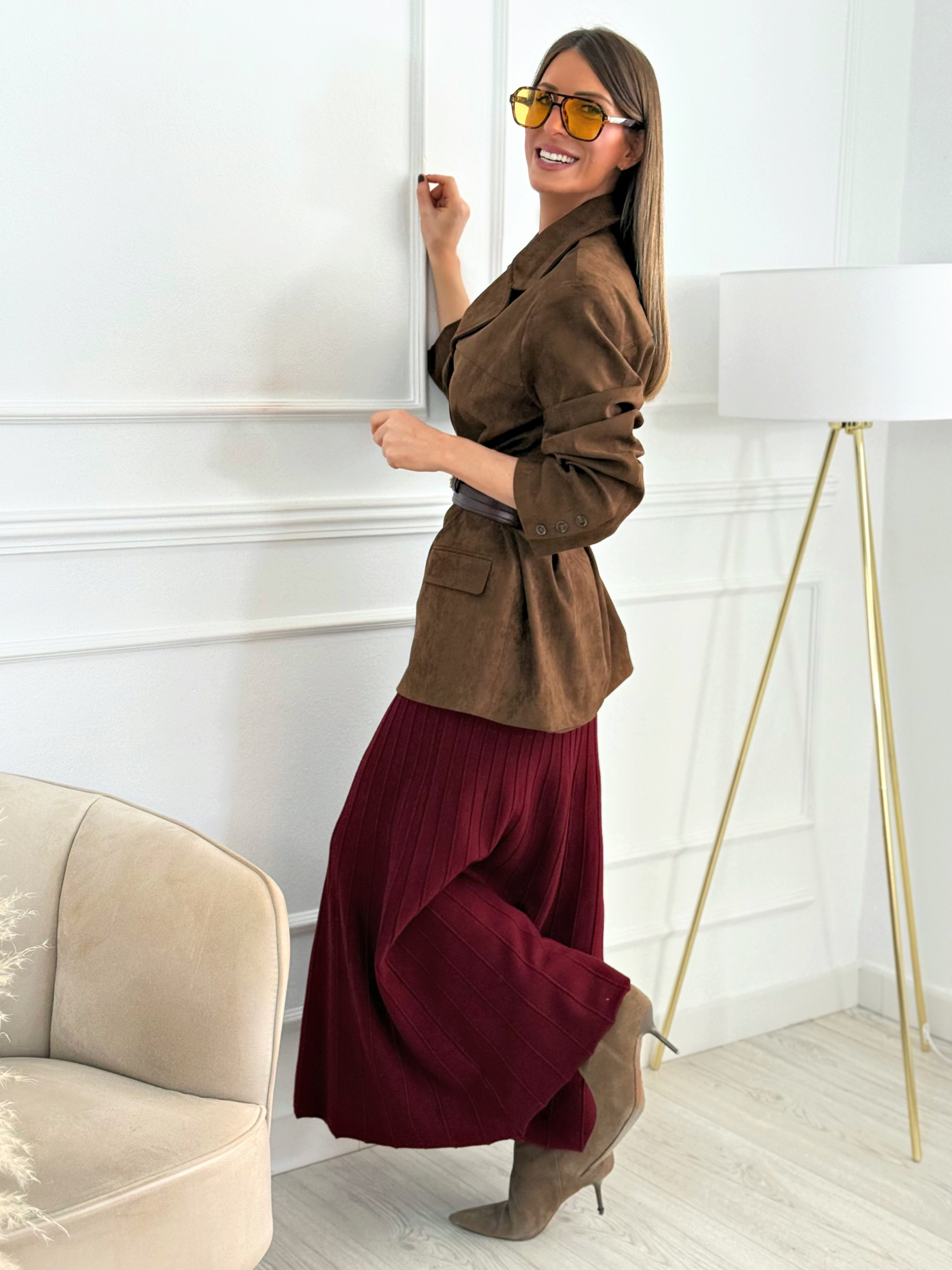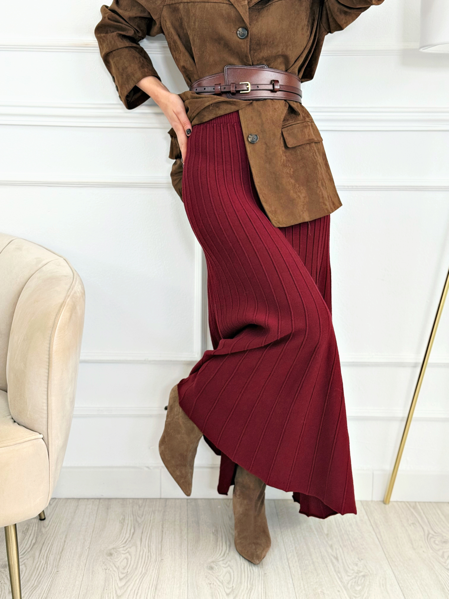 Falda larga de punto canalé en un precioso tono burdeos. Su tejido suave, elástico y con caída la hace muy cómoda y favorecedora. Cuenta con cinturilla elástica que se adapta al cuerpo sin apretar y un corte recto que estiliza la figura. Ideal para combinar con botas, deportivas o blazers para crear looks elegantes, cómodos y versátiles. Una prenda atemporal imprescindible esta temporada.