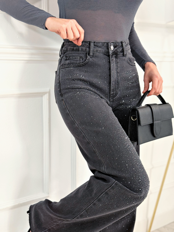 Jeans negros de mujer con aplicaciones de strass distribuidas por todo el tejido, aportando un brillo discreto y sofisticado que eleva cualquier look. Están confeccionados en un tejido suave con ligero elastano, lo que garantiza comodidad sin perder estructura. El tiro alto estiliza la cintura y alarga visualmente las piernas, mientras que el corte recto aporta una silueta moderna, favorecedora y muy versátil.
