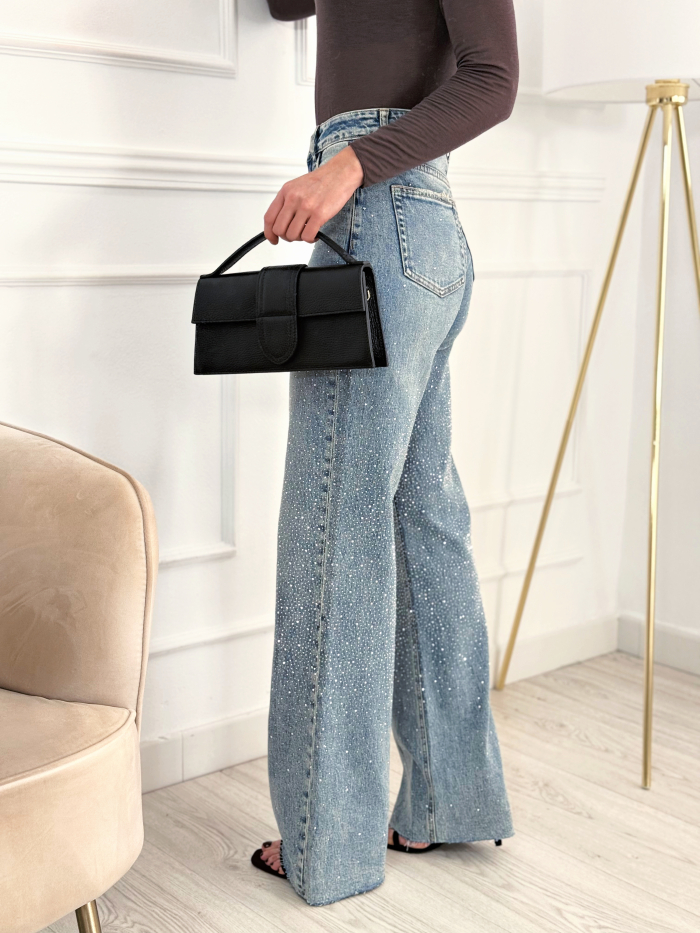 El diseño de strass aporta un acabado sofisticado sin resultar excesivo, convirtiendo este vaquero en una prenda versátil para looks de día con estilo y outfits de noche más especiales. Combina a la perfección con bodies, tops ajustados, blusas o jerséis lisos.