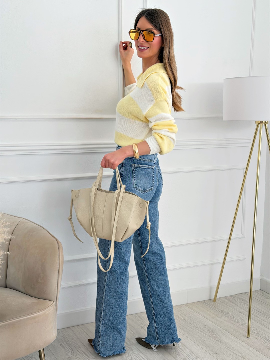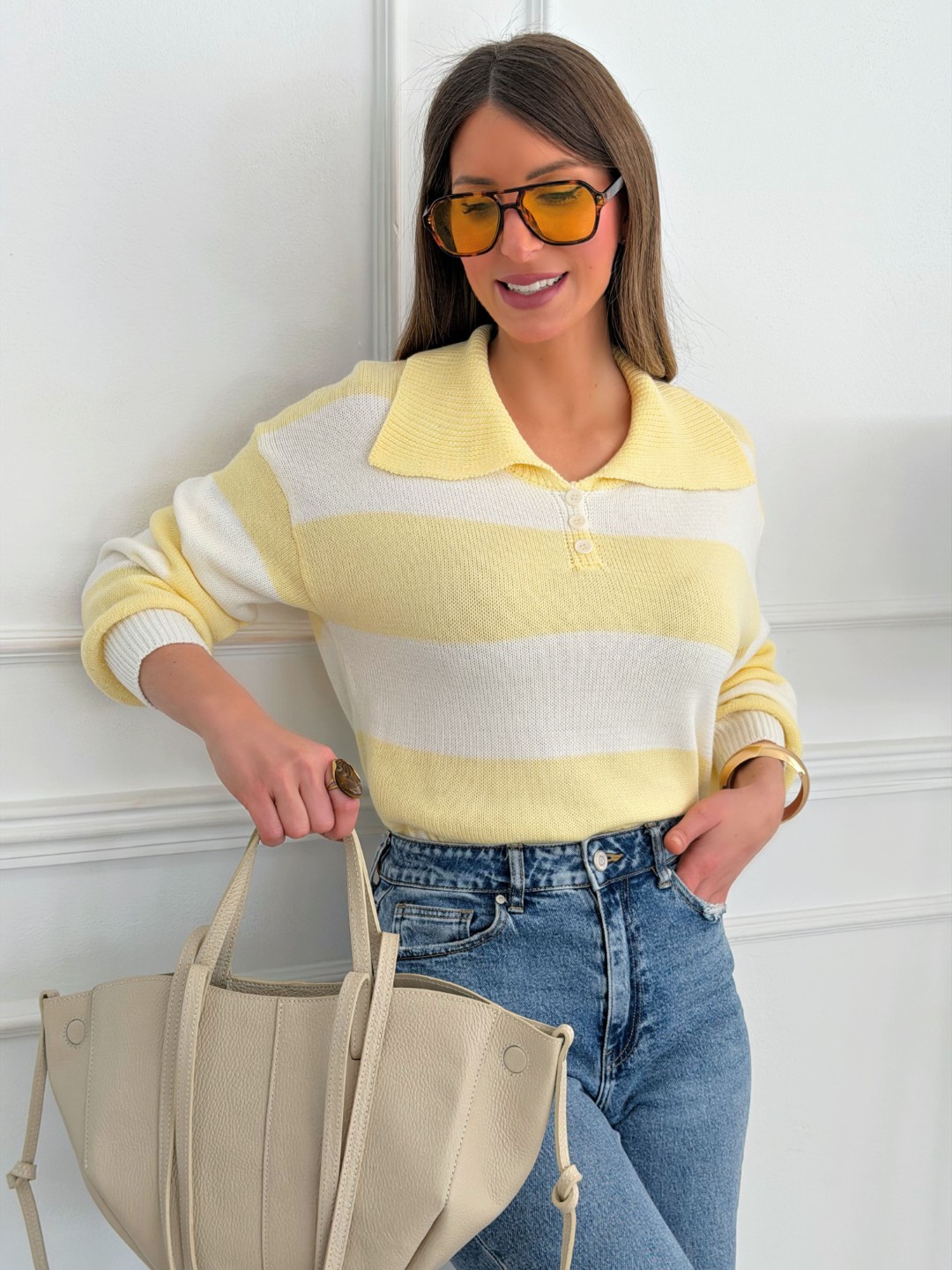 Perfecto con jeans rectos o wide leg para un look casual luminoso. Ideal con pantalón blanco para potenciar la frescura del amarillo. También combina genial con accesorios en tonos beige, camel o dorados para un estilismo más sofisticado.