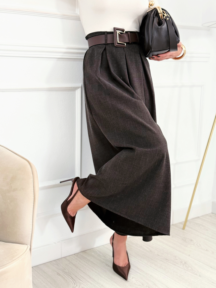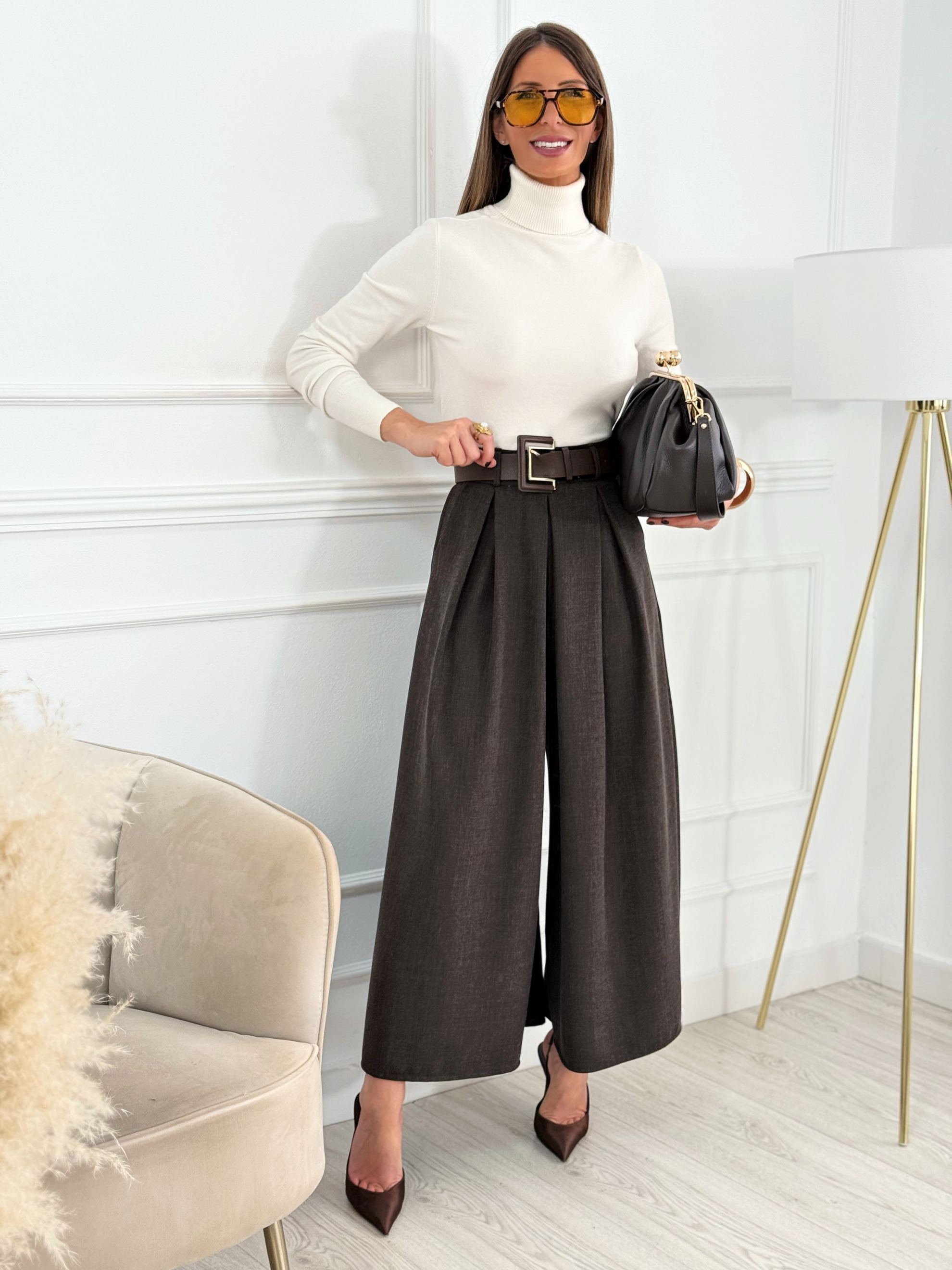 Pantalón tipo balloon en tono chocolate, con un diseño de pierna amplia que se estrecha ligeramente hacia el bajo, creando una silueta moderna y favorecedora. Confeccionado en un tejido fluido con caída elegante, presenta pinzas frontales que aportan volumen y estructura. Incluye cinturón y cintura elástica en la parte trasera para un ajuste perfecto. Su estilo versátil lo convierte en una prenda ideal para looks sofisticados o casuales con un toque chic.