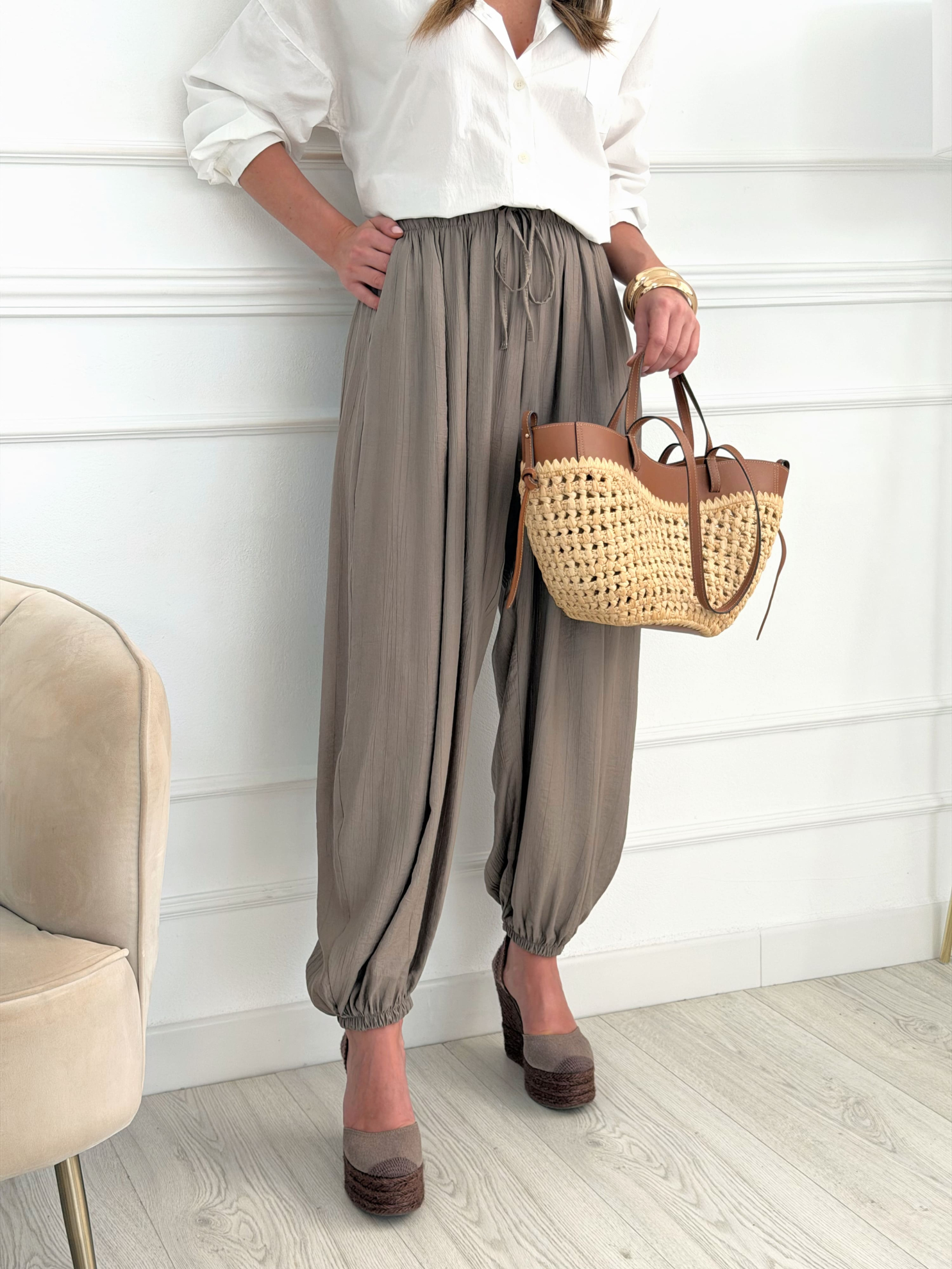 Este pantalón bombacho en color taupe es una prenda imprescindible para crear looks neutros, elegantes y muy fáciles de combinar. Su diseño de pernera amplia con bajo ajustado estiliza la silueta y aporta un aire moderno, mientras que el tejido fluido garantiza movimiento y comodidad en cada paso.
