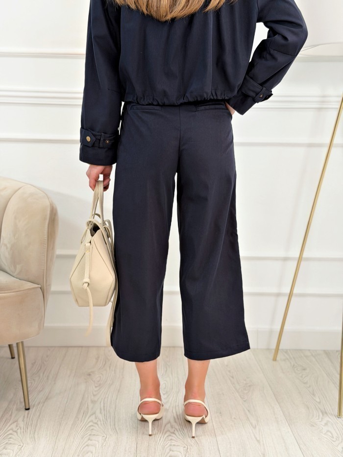 Pantalón en tono marino con diseño elegante y minimalista, perfecto para crear estilismos sofisticados y actuales. Confeccionado en tejido de poliéster, ofrece una estructura ligera y cómoda que mantiene bien la forma y aporta un acabado pulido al look.