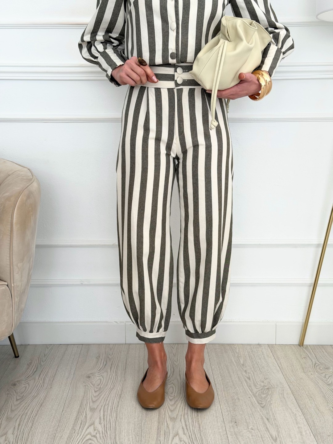 Pantalón de mujer con estampado de rayas verticales en tonos crudo y verde, una prenda elegante y muy favorecedora que estiliza visualmente la figura gracias a su diseño de líneas verticales.