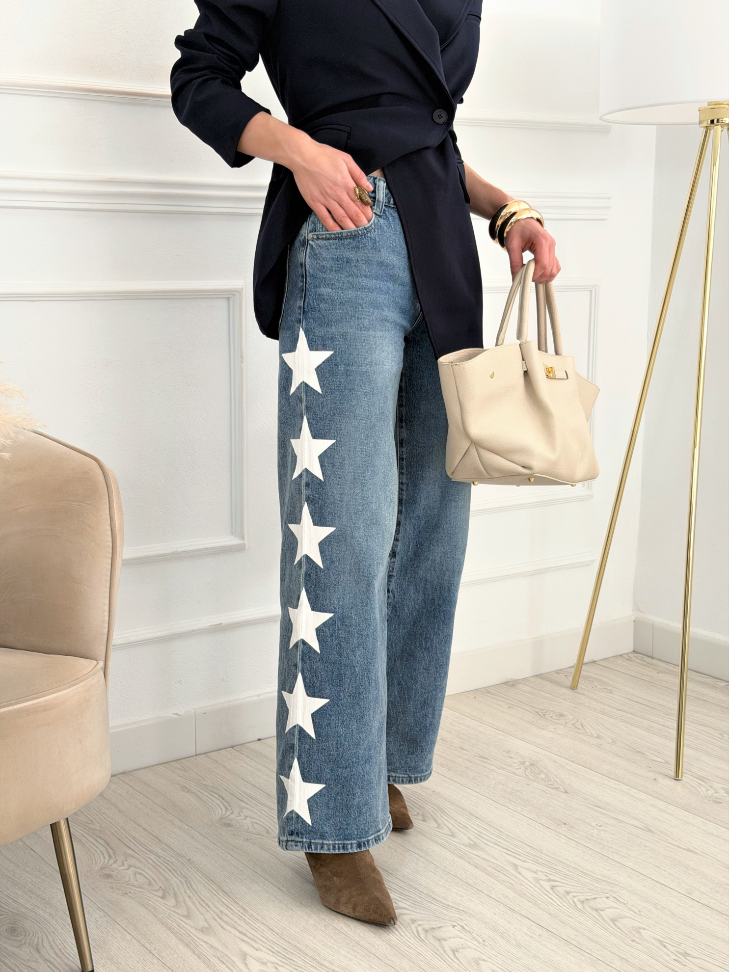 Jeans wide leg. Tiro alto. Cierre frontal con botón y cremallera. Bolsillos delanteros y traseros funcionales. Detalle de estrellas laterales en contraste. Tejido denim con ligera elasticidad. Diseño cómodo, estilizador y actual.