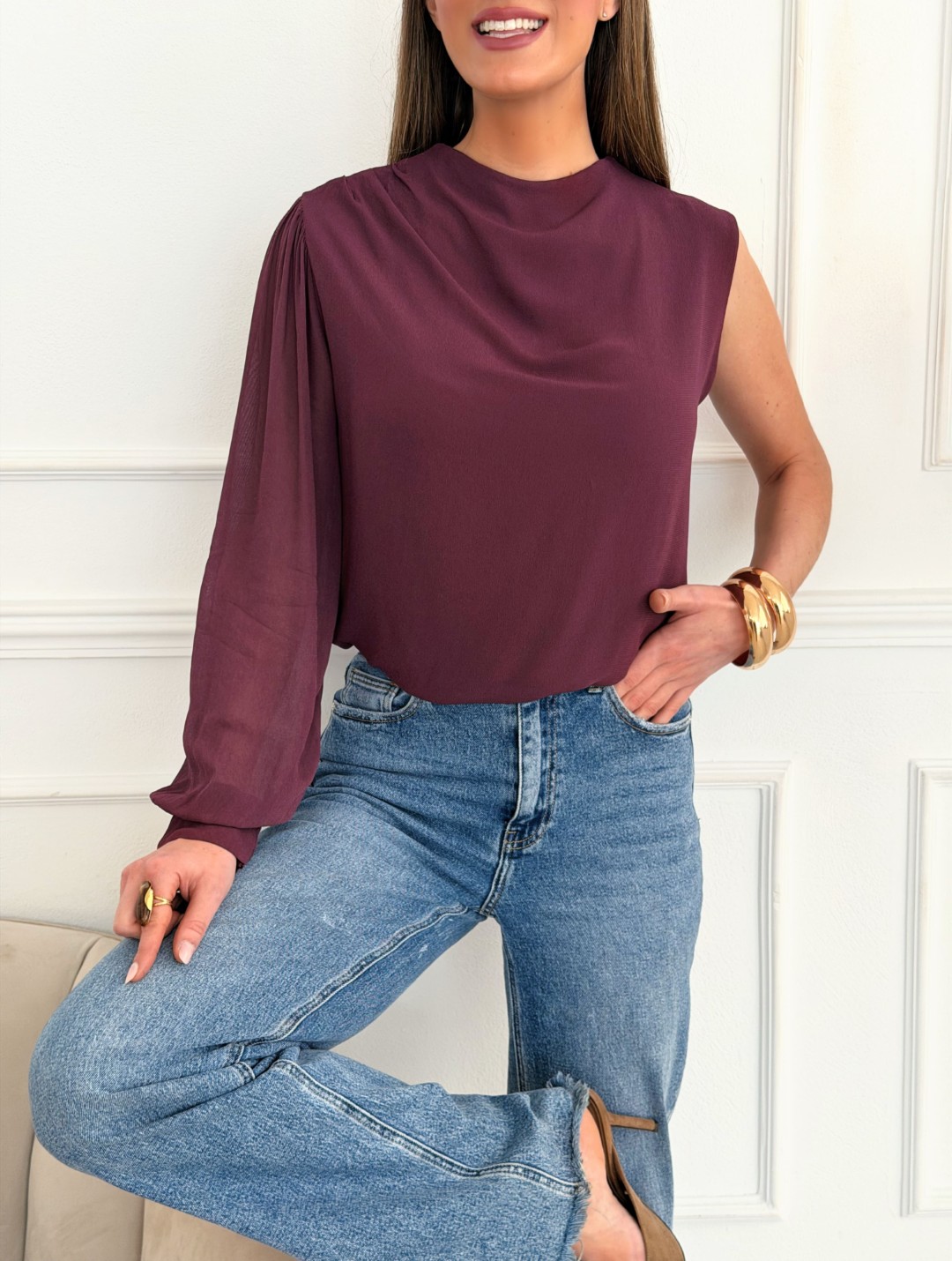 Blusa de mujer elegante en color burgundy con diseño asimétrico de una sola manga, una prenda sofisticada que aporta estilo y personalidad a cualquier look. Su diseño fluido y minimalista crea una silueta elegante y muy favorecedora, perfecta tanto para estilismos de día como para outfits más arreglados.
