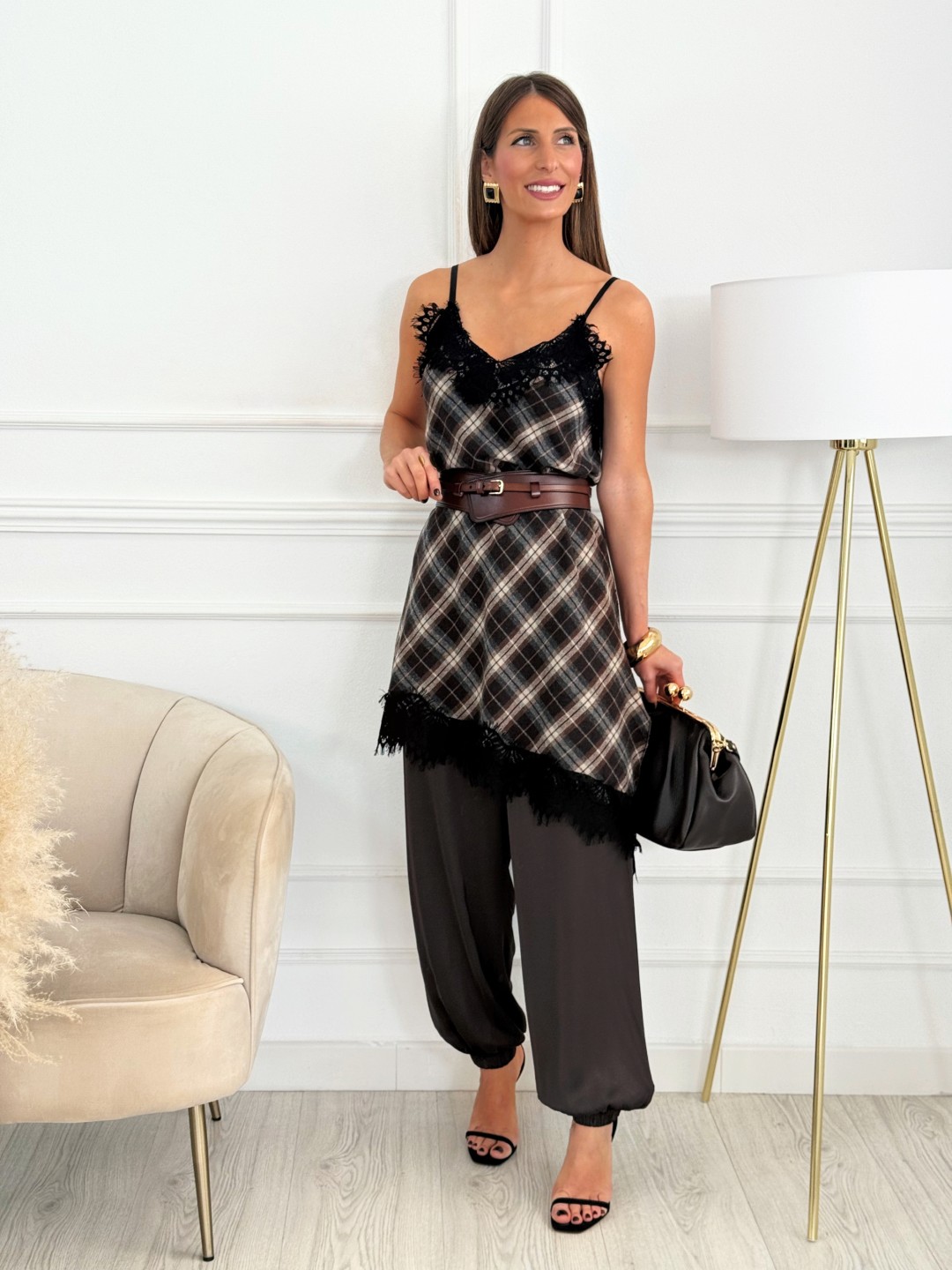 Top tipo lencero con estampado de cuadros en tonos marrones y negros, decorado con encaje negro en el escote y el bajo. Su corte asimétrico, más largo por detrás, le aporta movimiento y un toque original. Los tirantes son finos y regulables, permitiendo un ajuste perfecto. Una prenda muy favorecedora que puedes llevar tanto por dentro del pantalón como suelta, sola o combinada con una camisa o jersey debajo.