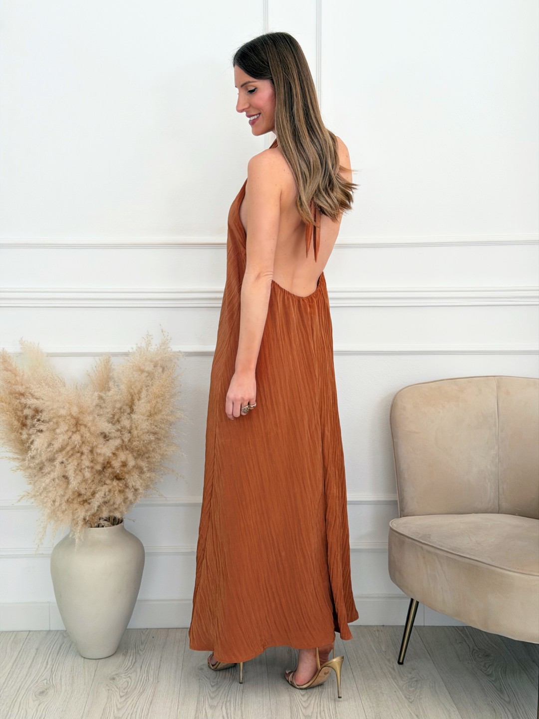 • Detalles: Escote halter, espalda completamente al aire, tejido con caída y elástico.