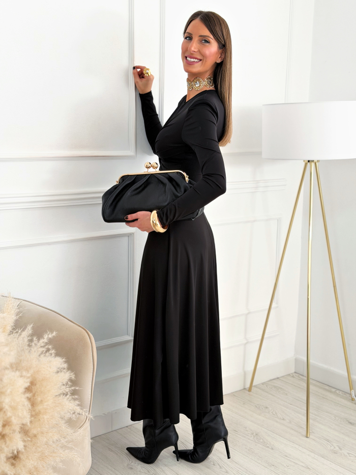 Vestido largo en tono negro confeccionado en tejido elástico de poliéster y elastano, que se adapta al cuerpo manteniendo una silueta estilizada y sofisticada. Su diseño con frunce central en la parte delantera define la cintura y aporta un toque refinado. Presenta escote redondo, manga larga y falda con caída suave hasta el tobillo. Su tejido tiene un acabado satinado sutil que aporta elegancia y versatilidad. Es una prenda perfecta para eventos, cenas o celebraciones, tanto de día como de noche.