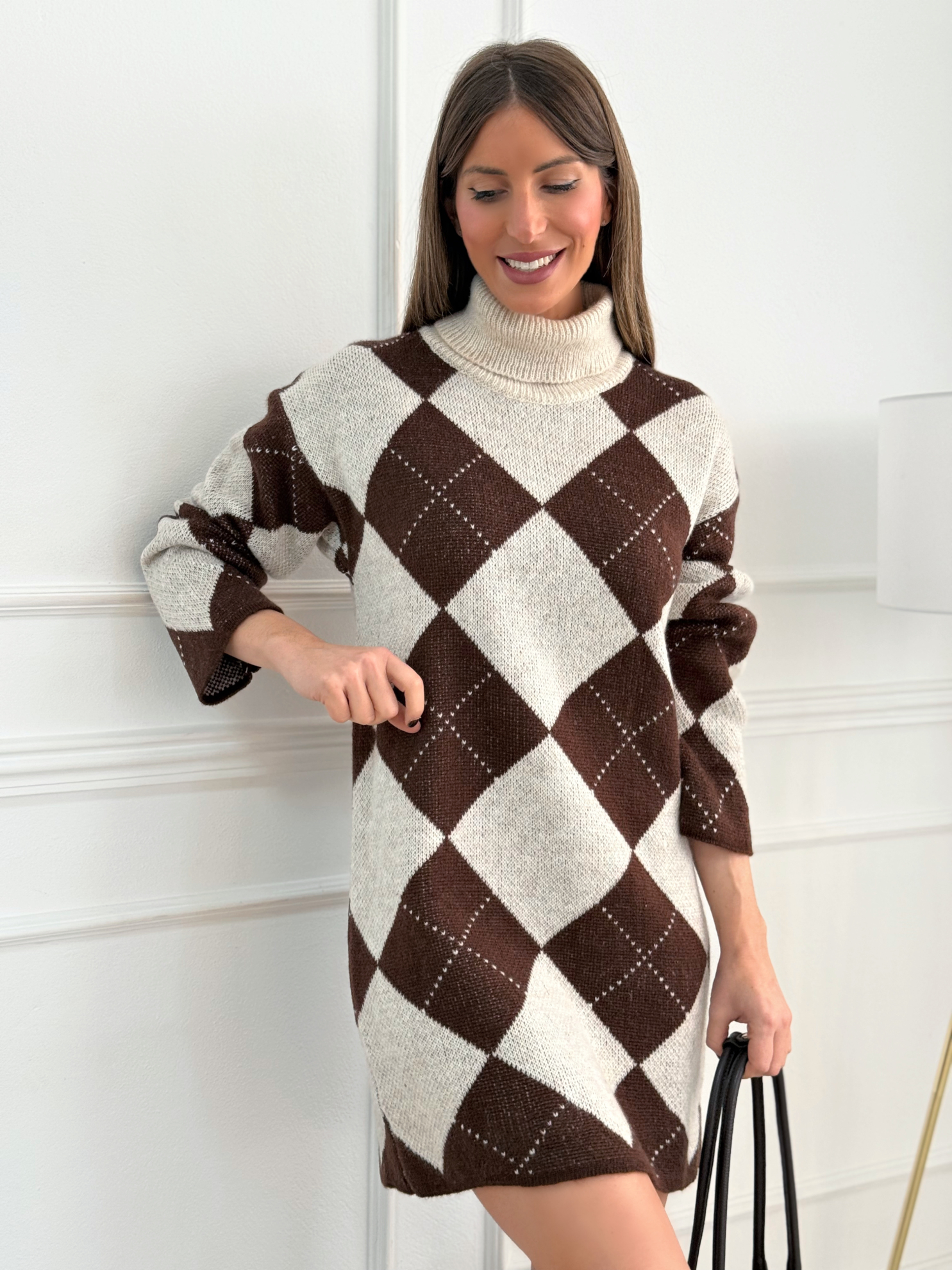 Vestido de punto confeccionado en tejido suave y calentito, con un elegante estampado de rombos en tonos crudo y marrón que aporta un estilo cálido y atemporal. Su diseño de cuello alto tipo cisne proporciona abrigo y confort, mientras que su corte recto ligeramente holgado se adapta con facilidad a distintas siluetas. El largo por encima de la rodilla lo convierte en una prenda práctica y muy versátil, perfecta tanto para el día a día como para ocasiones más especiales. Un vestido cómodo y estiloso que no puede faltar en tu armario de temporada.
